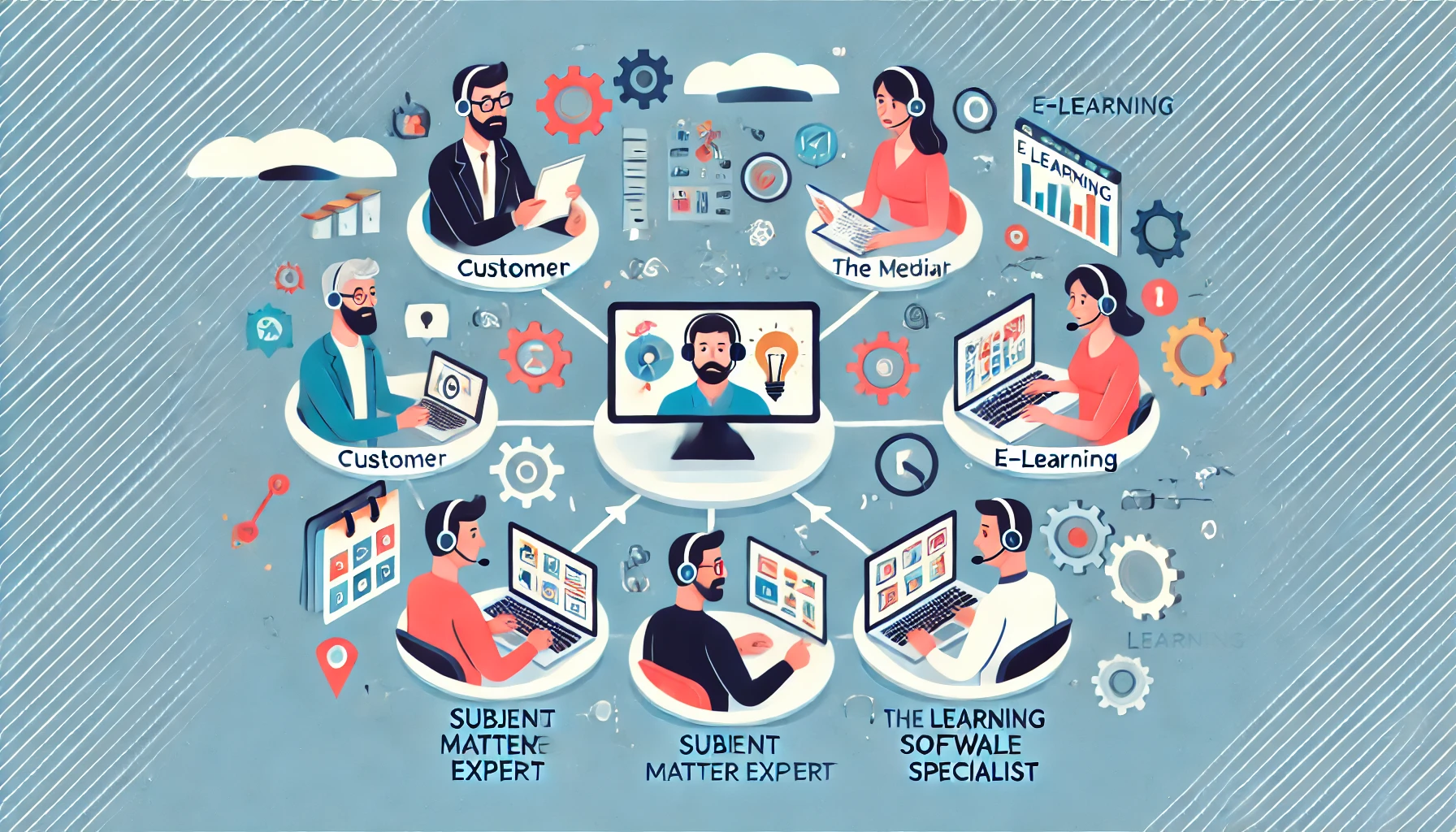 Indenfor e-læring er der mange roller og her vil jeg kort løbe hen over kundens rolle, emneekspertens, mediespecialistens, e-læringsspecialistens og specialisten i læringssoftwares rolle og derefter fortælle om mine erfaringer.